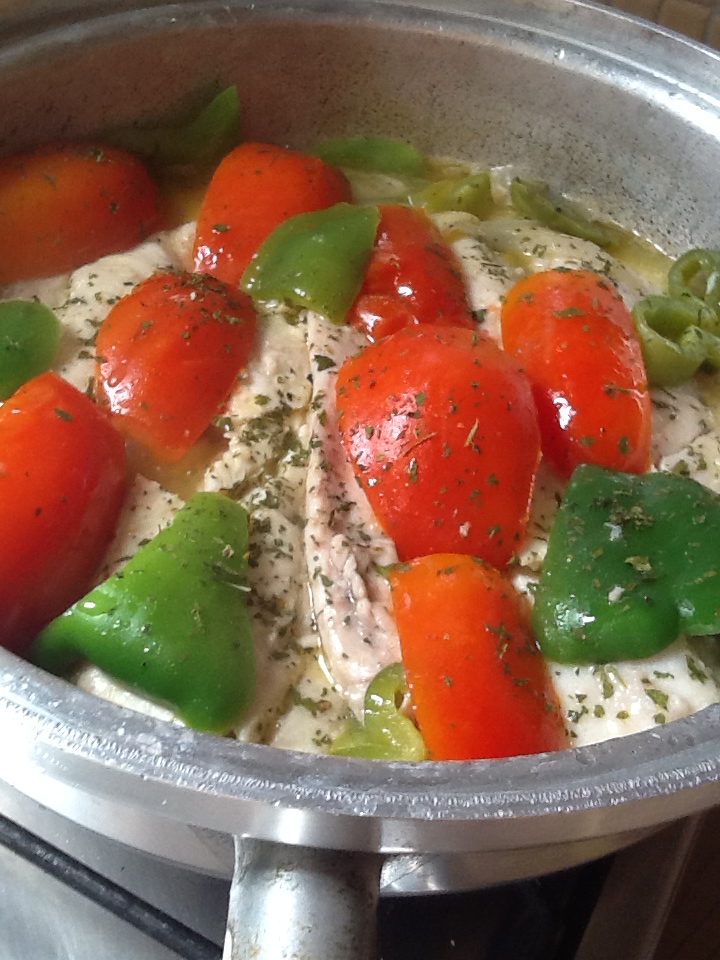 Levar ao fogo brando e no final do cozimento acrescentar os pimentões e os tomates