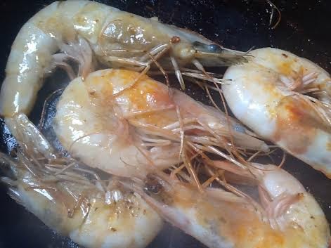Camarões inteiros selados em azeite, na foto abaixo camarões limpos selados rapidamente.
